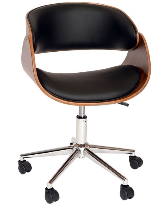 Our eccentric Julian Office Chair design features a walnut veneer finish seat and black Leatherette. The cushioning provides both stability and comfort, and the 360 degree swivel makes maneuvering the chair easy around the office. Black plastic caster wheels are affixed to the bottom of a chrome-plated steel base and adjustable height gas piston. This mid-century and modern design adds a unique style to your home or desk office space. This choice of the Julian chair will unveil your personal style and creativity in the work place.Read More