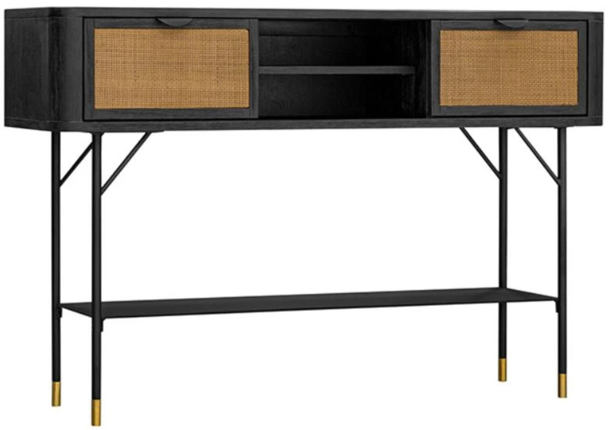 This console table has metallic legs are accented with brass caps to add just the right amount of glam to your home. Acacia wood is a popular choice for furniture because it has many advantages over other types of hardwood. The strength-to-weight ratio of acacia wood is one of the best in the world, making it perfect for furniture that needs to be lightweight but still durable. It is resistant to moisture and pests and does not warp. If you are looking for a durable, long-lasting material for your furniture, then acacia wood is worth considering. Place in the entryway for a functional key hub, behind the sofa in the living room, or in any open concept living space. Our streamlined console table rests upon a slender rectangular metallic base to bring elegance to your home or apartment. The sturdy base and durable acacia top leave a small footprint - making this a welcome addition regardless of your home size. With two drawers and an open shelf, our console table comes in handy behind the sofa, uplifts the decor of your entryway and foyer, or serves as a storage unit in your dining room, bedroom, home office, or study. The Saratoga console table features a chic black acacia finish and natural rattan accents on the drawers.