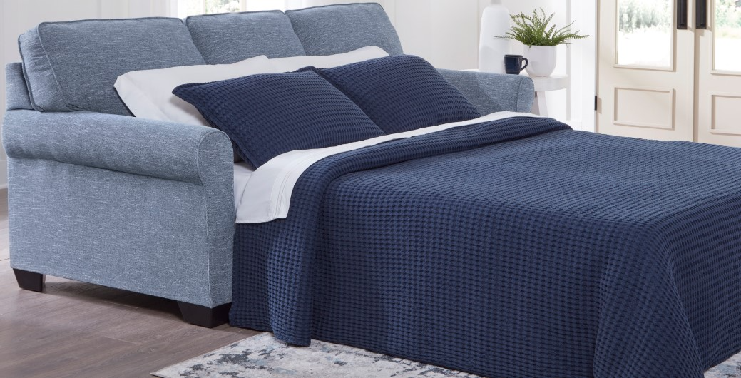 This queen sofa sleeper is defined by comfort, convenience and classic style. Soft to the touch and stain-resistant, the family-friendly Next-Gen Nuvella™ fabric is easy to maintain. And you'll love the universal appeal of its denim-inspired hue. And there's always room for guests thanks to the convenient pull-out mattress.Read More