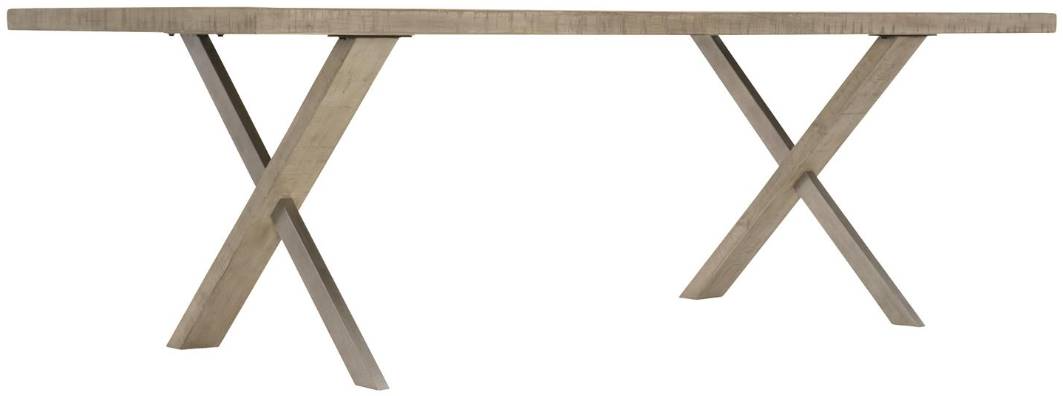 The distressed pine is finished in a muted gray Morel, highlighting the grain and imperfections in the wood. Metal legs in a Glazed Silver finish intersect with wood legs on the eye-catching base.
