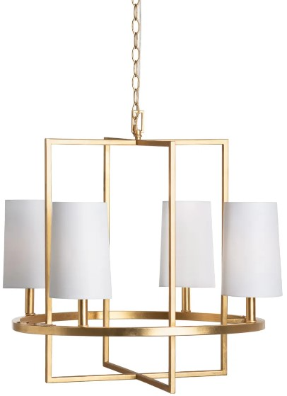 Crestview Collection's Fields Four Light Chandelier is the epitome of modern-industrial elegance. This sleek metal design is crafted in a satin gold finish and includes four white linen lamp shades. Candelabra bulbs are required for illumination and mounting hardware is included.Read More