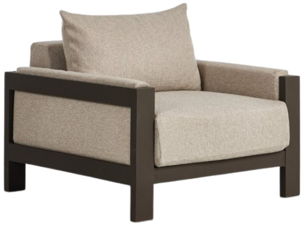 Framed by bronze metal with wide proportions and soft, thick cushioning for effortless comfort designed for outdoor lounging. Light upholstery and minimalist form makes this an easy outdoor chair to move between different styles and settings. Cover or store inside during inclement weather and when not in use.Read More