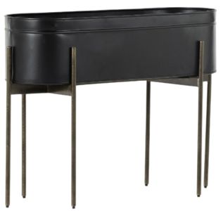 Slim legs of dark brass-finished iron support an inset planter of rounded weathered brass iron in matte black. Comfortably holds three large plants. Plastic plant liner recommended (not included). Cover or store indoors during inclement weather and when not in use.Read More