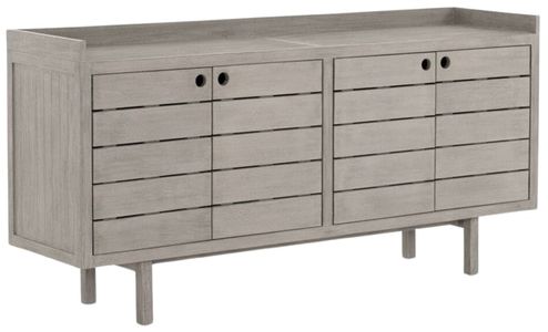 Bring style and storage outdoors. Washed brown-finished teak features slatting for an open, textural look, with cutout openings in place of hardware. Gallery top ready for outdoor entertaining. Cover or store inside during inclement weather and when not in use.Read More
