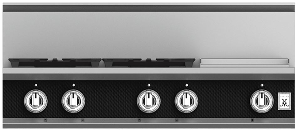 The 36” Hestan rangetop delivers searing culinary power with a sealed burner system delivering exceptional temperature control for culinary power up to 23,000 BTUs and as low as 500 BTUs. The 12” commercial-grade stainless steel gas griddle makes breakfast a cinch with superior heating and a thermostat for precise temperature control, while the continuous grates and backlit knobs combine stunning form and function.
