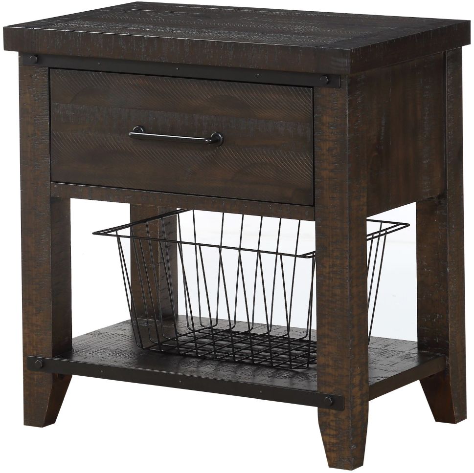 Give this nightstand with a metal basket to use on its open shelf to your bedroom a contemporary farmhouse style look. With its distressed pine veneers, it provides a distinctive look complemented by metal accents of industrial style with details of rivet style. Protect and organize your fragile possessions with this item's included felt-lined drawer(s). Felt lining keeps items in place as you open and close the drawer, preventing items from tangling and keeping them free from scratches.