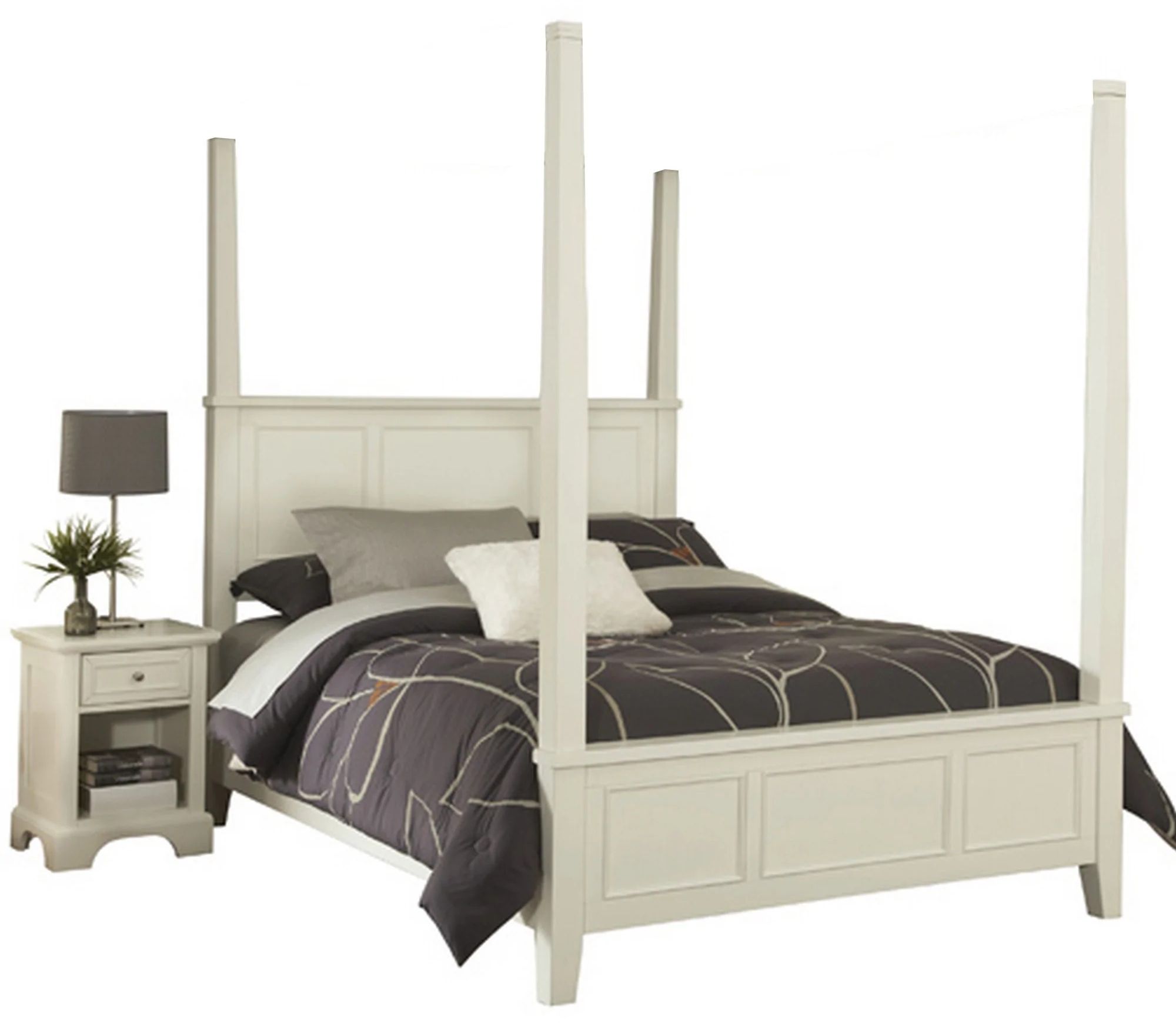 Unadorned details such as the straight and curved lines, and slightly flared legs create the contemporary style of the Naples Queen Poster Bed and Nightstand by homestyles. This set is constructed of hardwood solids and engineered wood in a smooth, white finish. Bed features include raised panels on the headboard and footboard. Nightstand features one storage drawer and one open storage area. Brushed nickel hardware. Bed Size: 63.5w 88d 80h. Nightstand Size: 18w 16d 24h.