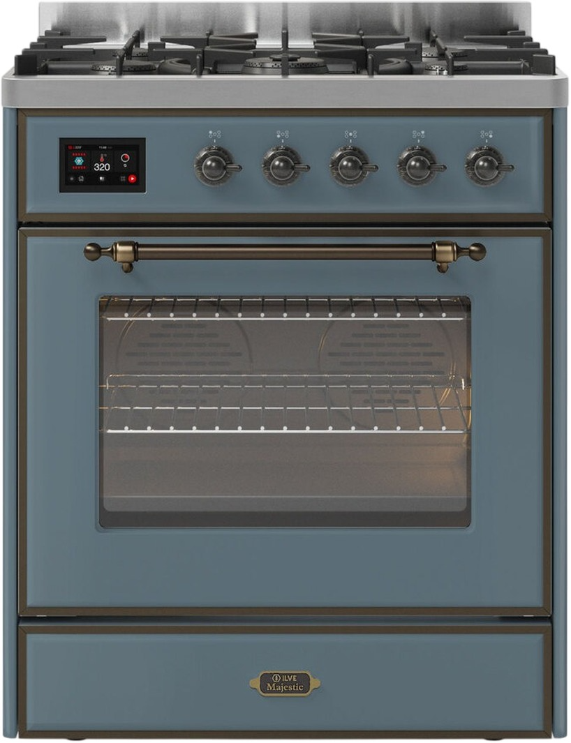 The 30" Majestic dual fuel range combines the classic Italian style and cutting-edge innovative technology, where form meets function. This range features a 5 gas burner cooktop, equipped with a total black brass flame spreader that has a non-stick nanotechnological coating and boasts a spacious 4 cu. ft. oven capacity.Read More