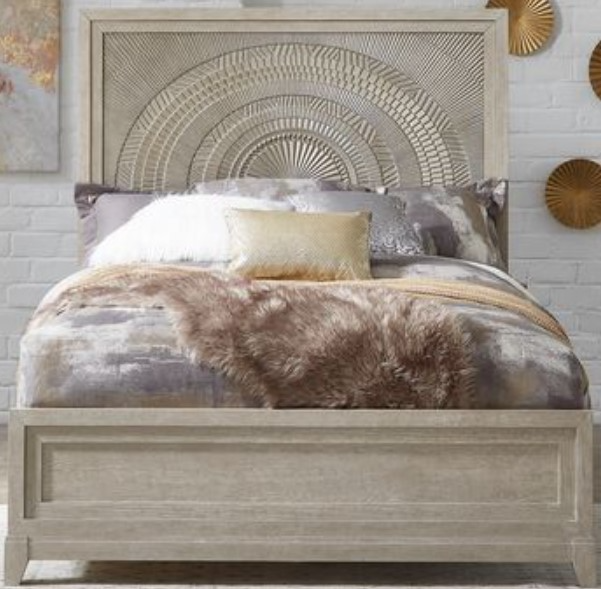 Make a statement with the Belmar panel bed. Crafted with rubberwood solids and split heart oak veneers, the washed taupe and silver champagne finish is accented by dusty gray wax that creates a unique look from piece to piece. The decorative tile headboard paired with the low-profile footboard completes your contemporary look.Read More