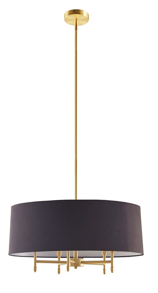 Introduce a gorgeous transitional look to your decor with Hampton Hill’s Presidio Chandelier. Featuring a black tapered fabric shade that is able to tilt, this transitional chandelier adds a touch of elegance with the plated brass finish on the metal frame and ceiling cover. The ceiling drop down height is 62.5-inches with a 10-inch black cord to perfectly fit your space. Hardwire this chandelier to your ceiling, could be a sloped ceiling to create a display to illuminate your kitchen or living room. Five Type-B 40-watt incandescent bulbs or five 9-watt CFL light bulbs are needed. Mounting hardware and professional installation is required. Comes with a 2-year warranty.Read More