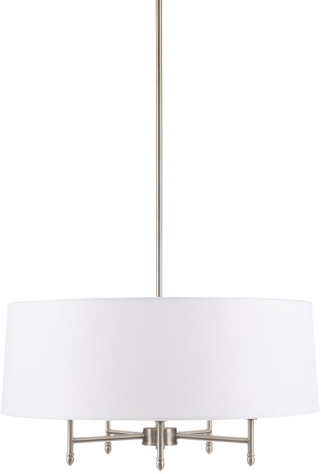 Introduce a gorgeous transitional look to your decor with Hampton Hill's Presidio Chandelier. Featuring a white tapered fabric shade with a silver finish on the metal frame and ceiling cover, this chandelier can tilt to direct the light and adds a touch of elegance to your home. The ceiling drop down height is 40-inches with a 72-inch black cord to perfectly fit your space. Hard wire this chandelier to your ceiling, but not on a sloped ceiling to create a stunning display that illuminates your kitchen, living room, or entry way. Comes with a 2-year limited warranty. 5 Type A light bulbs are needed. Mounting hardware and professional installation is required.