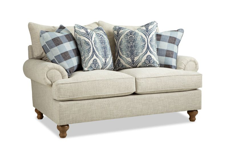 This casual loveseat, from the Paula Deen Home collection is one of our favorites, and a best seller too. It's easy to see why! For starters, it's a generous 100'' long and features an armload of pillows to curl up and relax on. The loose pillow backs, roll arms, and turned wood legs give it a laid back, casual look that Paula is so proud of! It also features her exclusive Down Blend cushions that wrap you in comfort from the first moment, but will last for years. This style is also available as a 2 -piece sectional in varying sizes. Also available are the matching loveseat, chair and a half, ottoman..