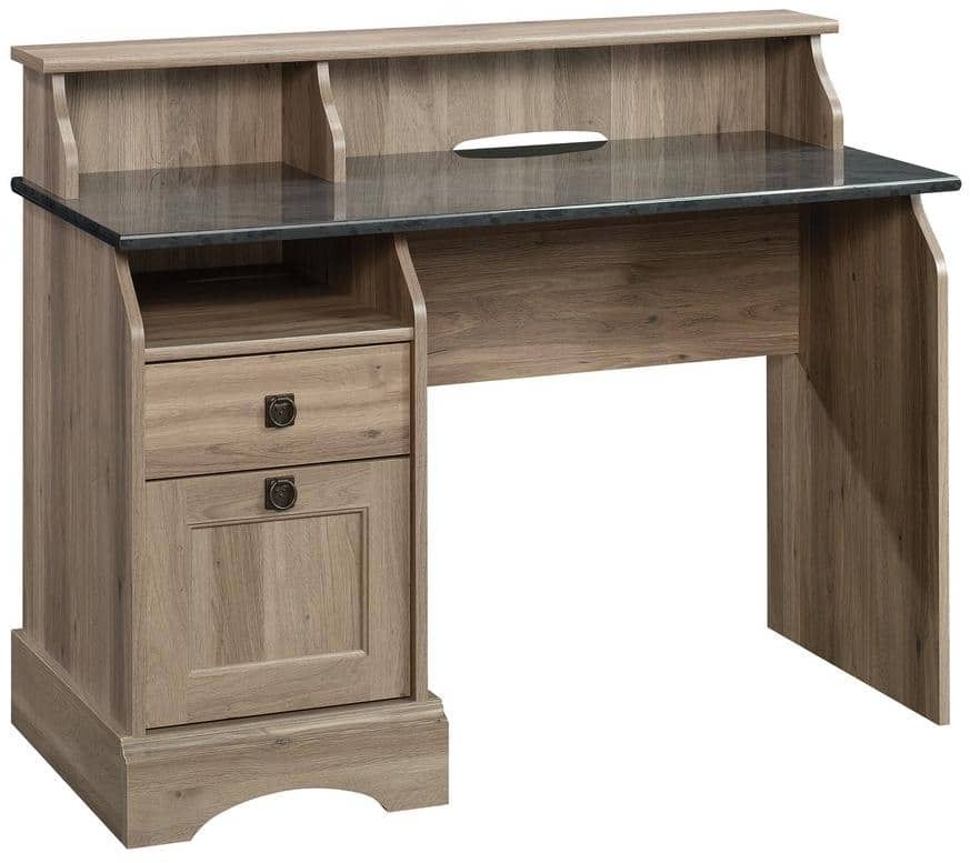 Upgrade the style and aesthetic of your home office/workspace with this desk from the Graham Hill collection. Its beautiful faux slate tabletop surface has room for all your office essentials and its EverSheen® top-coat provides a clear, durable finish that resists heat, stains, and scratches. This office desk also features two easy gliding storage drawers, a lower drawer with full extension slides to hold letter-size hangings files, and cubbyhole storage for optimal organization. Finished in Salt Oak with a Rosso Slate accent, this clean-cut desk looks good no matter where it stands.