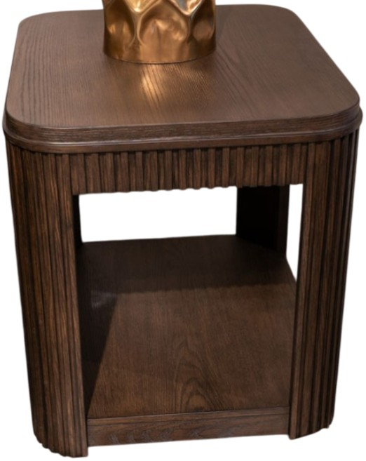 The table design features trend-right fluted aprons and corner posts contrasted perfectly with clean veneer tops and shelves for a contemporary vibe