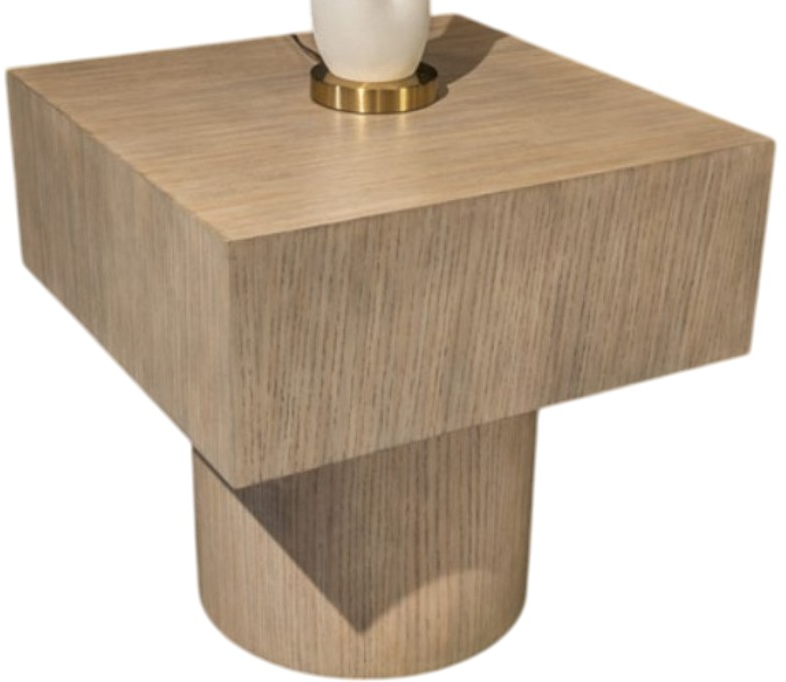 Thick square slab tops set on round plinth bases offer bold architectural styling