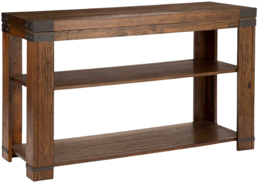 Simple, modern design elements with an industrial flair are found in the Arusha Occasional Collection. The Sofa table is sturdily constructed of hardwood solids and mango veneers in a beautiful medium cherry finish with metal bracket accents. A bottom shelf provides extra space for storage or display.Read More