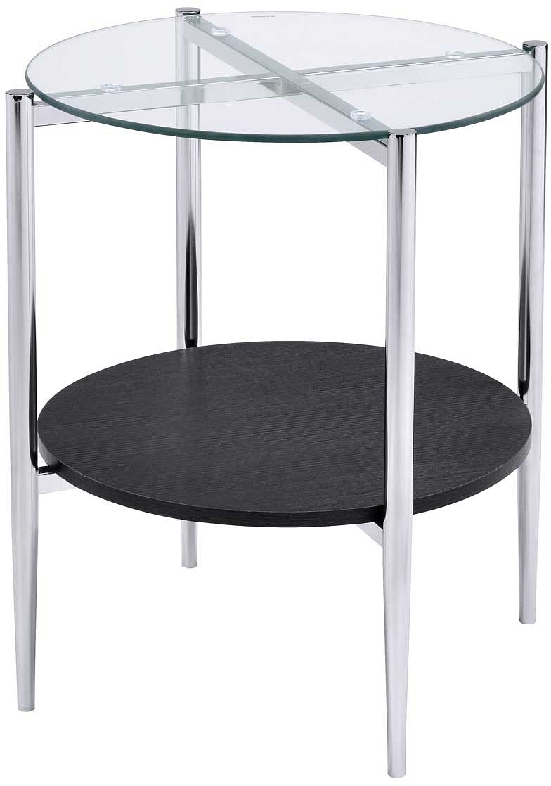 Add some sparkle to your life with the Bayliss occasional set. Mixed media elements abound in this table collection with tempered glass tops, chrome support legs and deep merlot finished bottom shelf combining in a modern elegant style that will become the centerpiece of your room. The end table fits smartly beside a chair or between upholstery pieces for a space for a treasured book or display item.