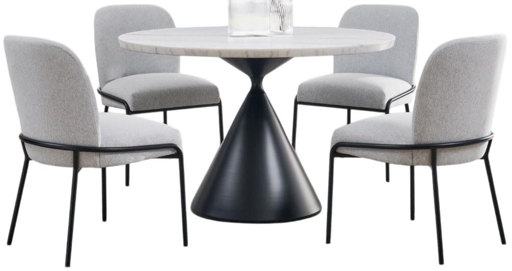 The Conrad 48″ round white marble top 5-piece dining set combines modern elegance and functionality. The table features a 1.5-inch marble veneer top with a black conical base, blending sleek sophistication with bold design. It comfortably seats four, perfect for intimate gatherings or everyday dining.Read More
