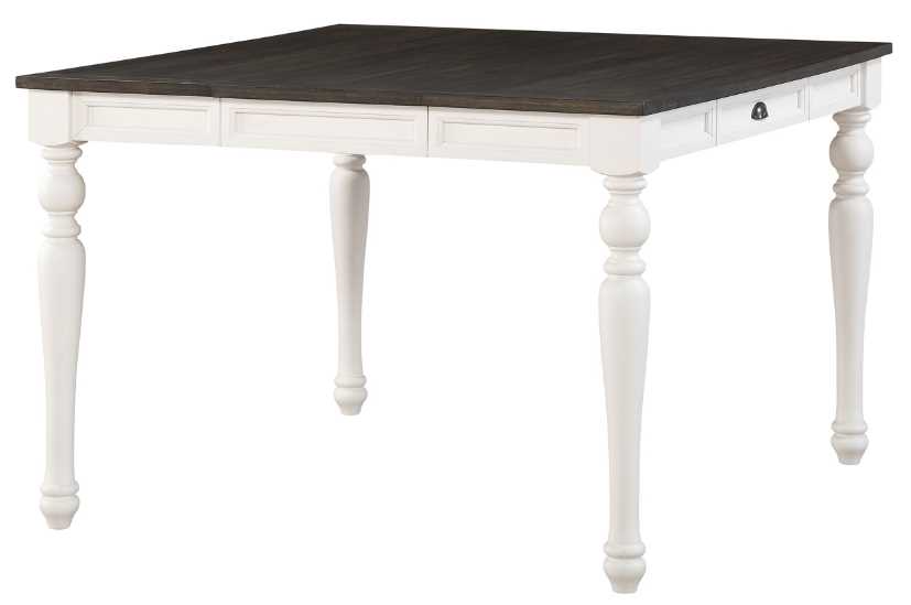 Table converts from rectangle to 54” square with a 18” leaf and features a working drawer.