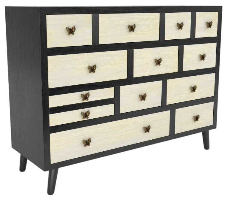 Papillon adds a little whimsy and a lot of function to any room with this 13-drawer accent sideboard. Antiqued brass butterfly pendants serve as the hardware on this artisan-crafted ebony and washed ivory finished cabinet that will bring a welcome design accent to any room.Read More