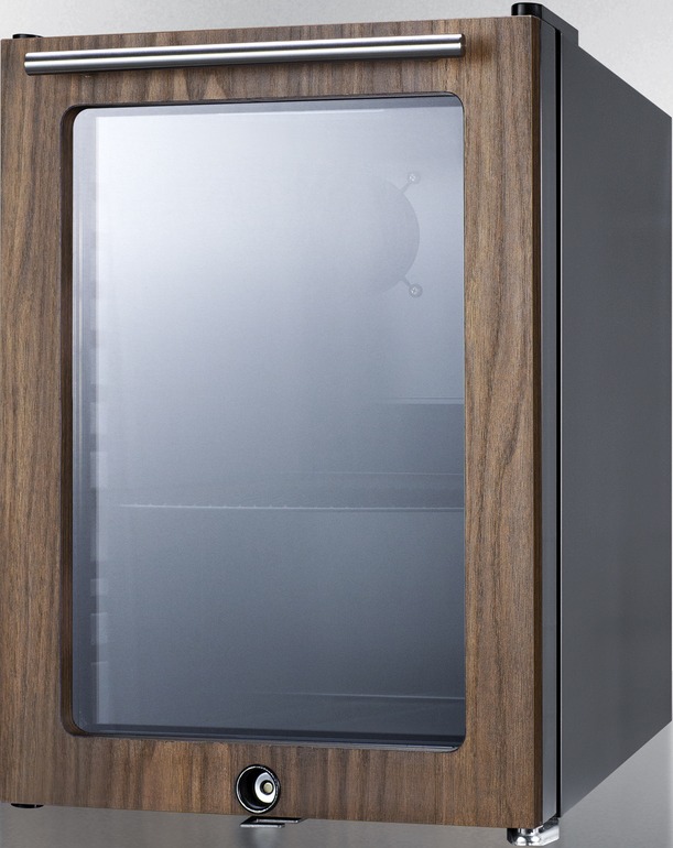 The SCR114LWP1 is a compact display refrigerator that is ETL-S listed to NSF-7 commercial standards and meets UL-471. It comes in a jet black finish with a double pane tempered glass door with a pre-installed engineered wood trim in a walnut finish for added elegance and durability. A stainless steel handle mounted horizontally affords easy opening, while a factory-installed lock offers added security. This unit has a sealed back for easier cleaning.