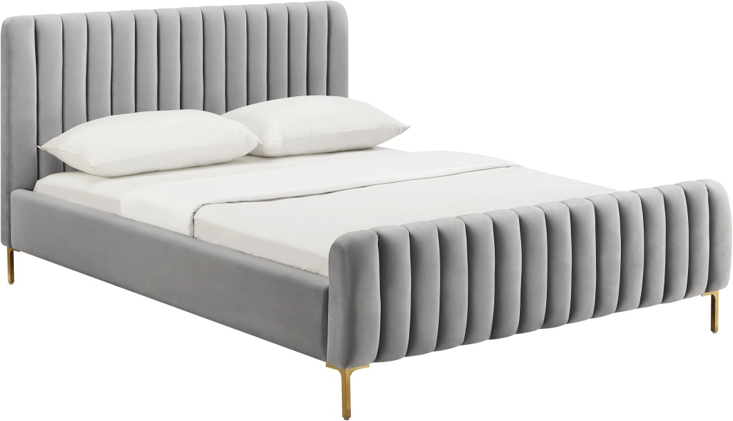We can’t guarantee your dreams will come true, but at least we can help you dream in style. The Angela bed features glam design, channel tufting and gold legs that pop against the sumptuous velvet upholstery. Available in full, queen, or king and multiple color options.
