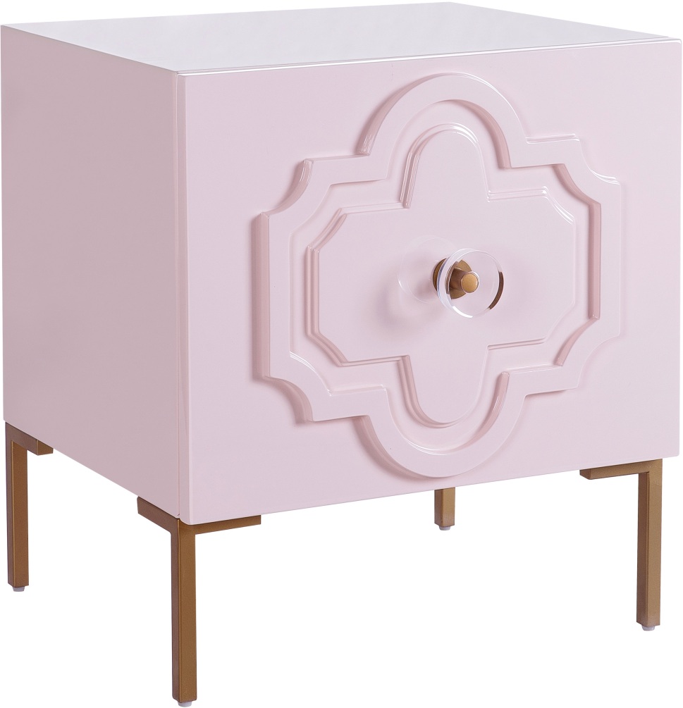 Parisian chic and Hollywood regency blend beautifully to create the Anna side table. Featuring a detailed carved door, lucite knob, and brass legs, this small piece adds a pop of style to your room. The door features self closing hinges while the interior shelf can be adjusted for height. Available in grey or pink lacquer color options.